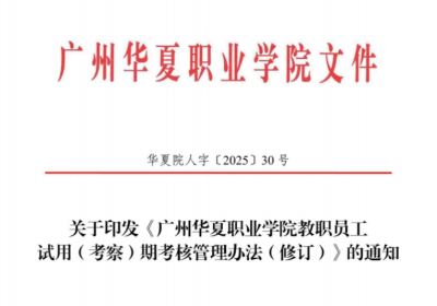 华夏院人字〔2025〕30号关于印发《广州华夏职业学院教职员工试用(考察)期考核管理办法(修订)》的通知