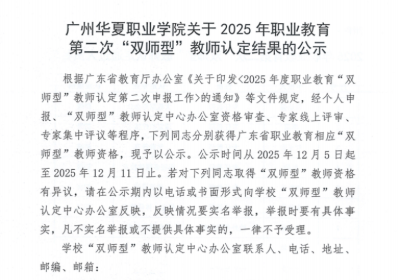 广州华夏职业学院关于2025年职业教育第二次“双师型”教师认定结果的公示